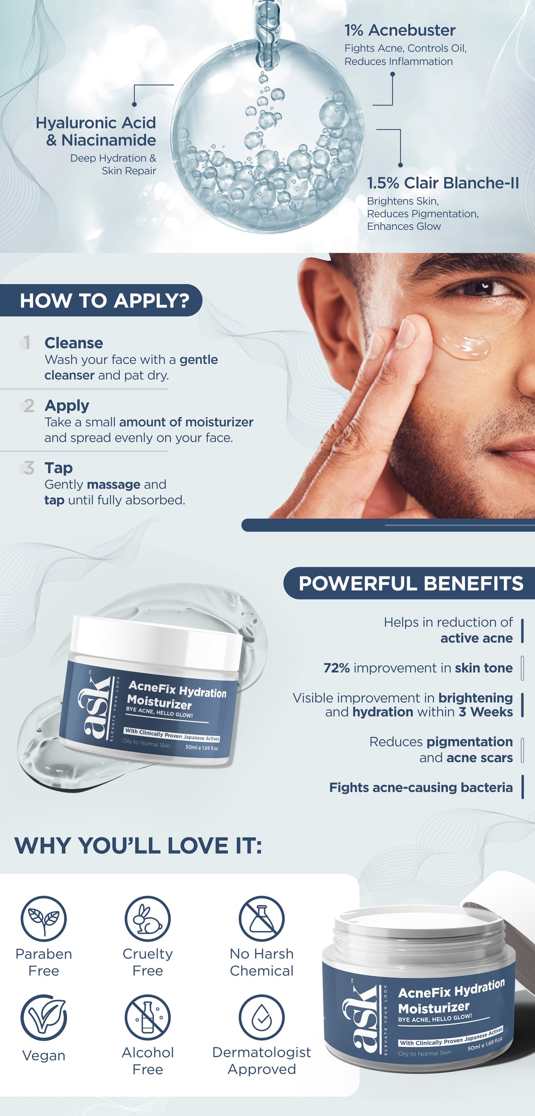 AcneFix Hydration is specially formulated for men with oily to normal skin who struggle with acne, dark spots, or uneven skin tone. It’s a lightweight gel texture, perfect for everyday use without clogging pores.