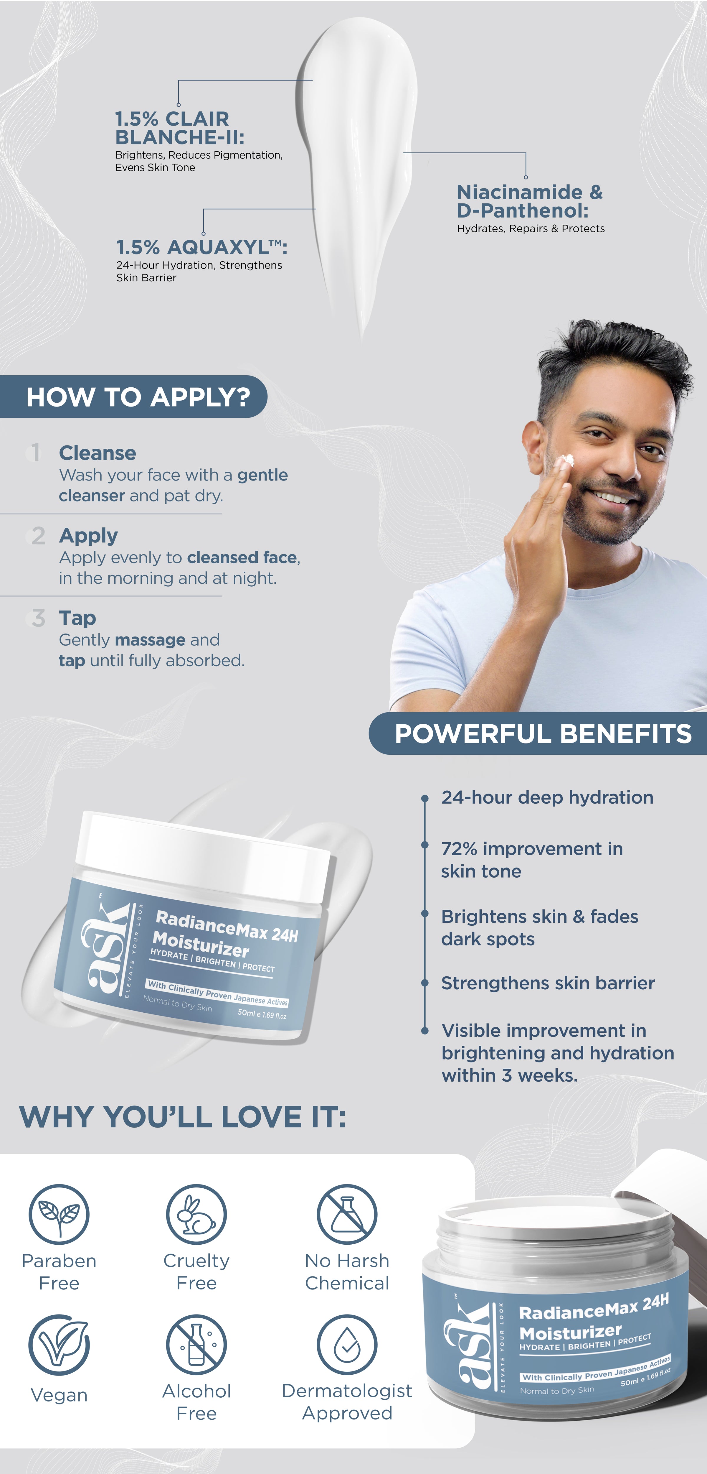 RadianceMax 24H combines Aquaxyl™ and Clair Blanche-II, two powerful Japanese actives that are clinically proven to deliver deep hydration, fade dark spots, and repair the skin barrier — all in one simple, effective cream.